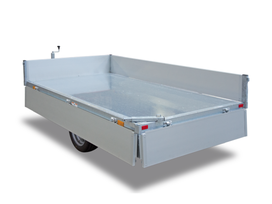 Geschweißte und feuerverzinkte Rahmenteile, integrierte Zurrbügel, eine Stahlkippbrücke und ein 3-stufiger Kippzylinder, der per Handpumpe bedient wird, gehören zu den serienmäßigen Features der HUK-Modelle.