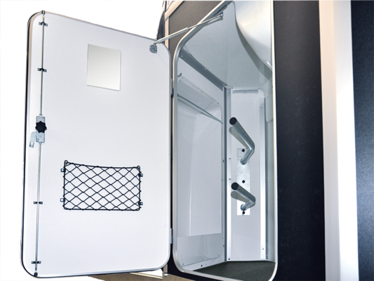 Der Aufbau ist beim BALIOS AERO aus mehrfach wasserfest verleimtem Spezialholz mit einer UV-beständigen Kunststoffbeschichtung. Die kompletten Einfassungen, auch die der Einstiegstüre sind ebenfalls aus eloxierten Aluminiumprofilen. Der massive Außenrahmen und die hintere seitliche Abstützung sind aus feuerverzinktem Stahlblech gefertigt.